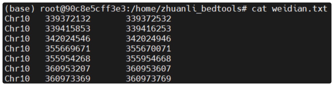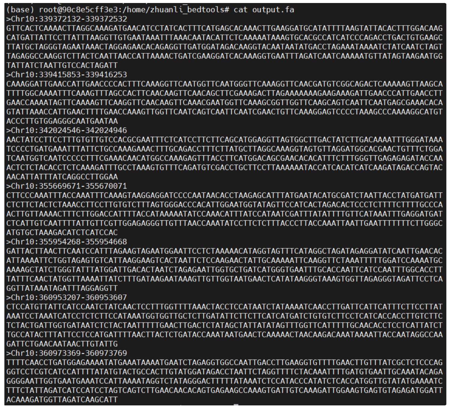bedtools getfasta -fi Tgra.chr.fa -bed weidian.txt -fo output.fa- 结果文件