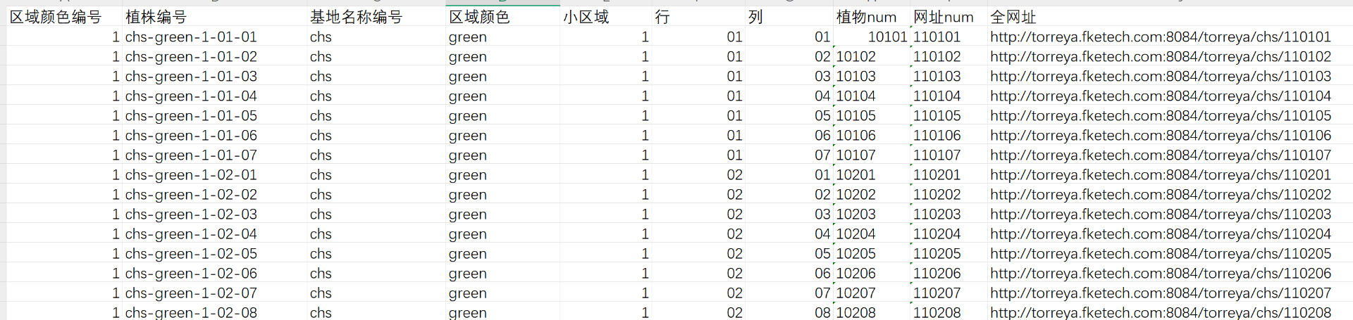 将表另存为csv文件(chs二维码编号统计信息-导入数据库版.csv),修改列名。 修改首行: 植物编号 -> title 基地名称 -> base name 植物num -> plant number 区域颜色编号 -> area color。