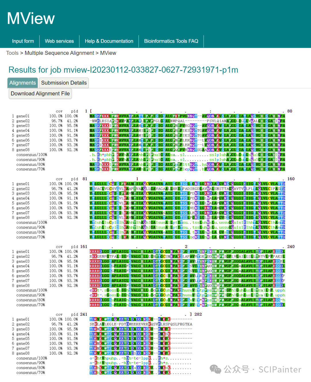 功能:将多序列比对的结果进行可视化,支持多种色彩方案和输出格式。
