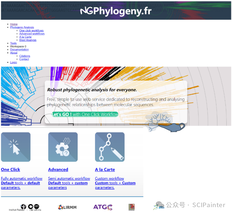 功能:一站式在线构建系统发育进化树,集成了多种比对和建树算法。