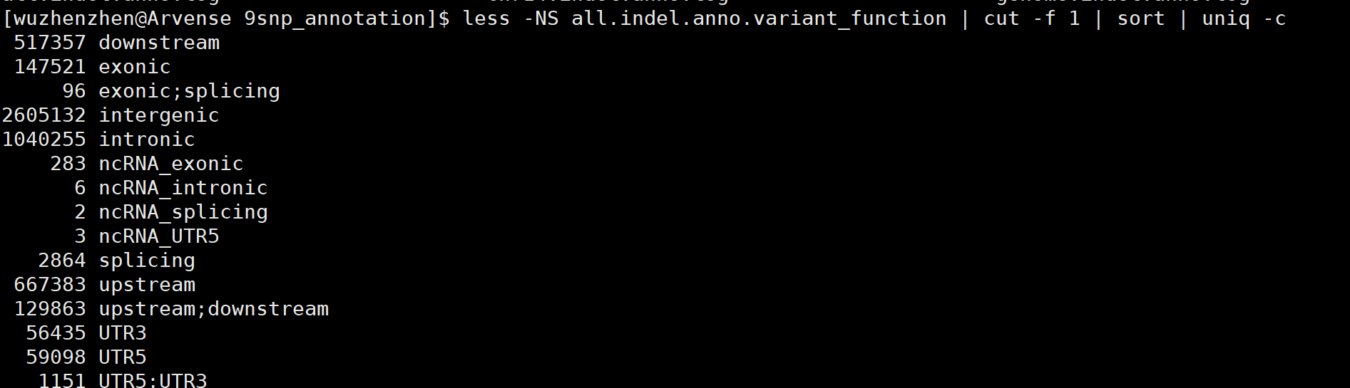 less -NS XXX.variant_function | cut -f 1 | sort | uniq -c