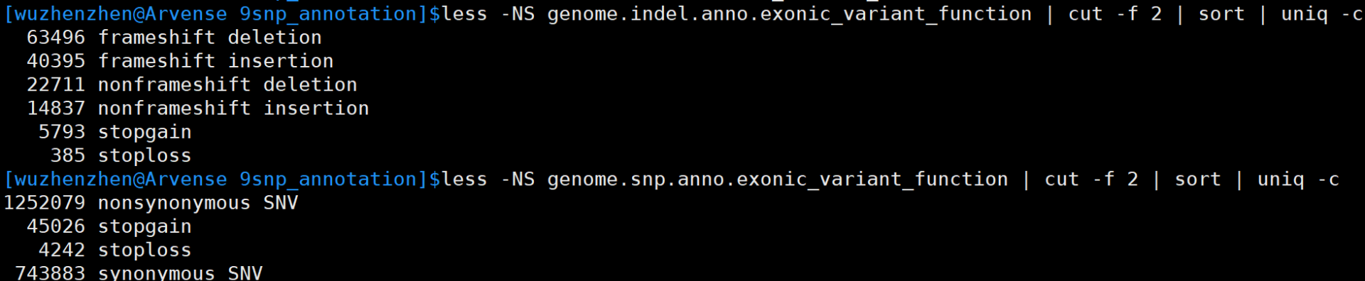 annotate_variation.pl -geneanno --neargene 2000 -buildver Rmolle -dbtype refGene -outfile genome.snp.anno -exonsort genome.snp.vcf.annovar.input ./03 结果统计