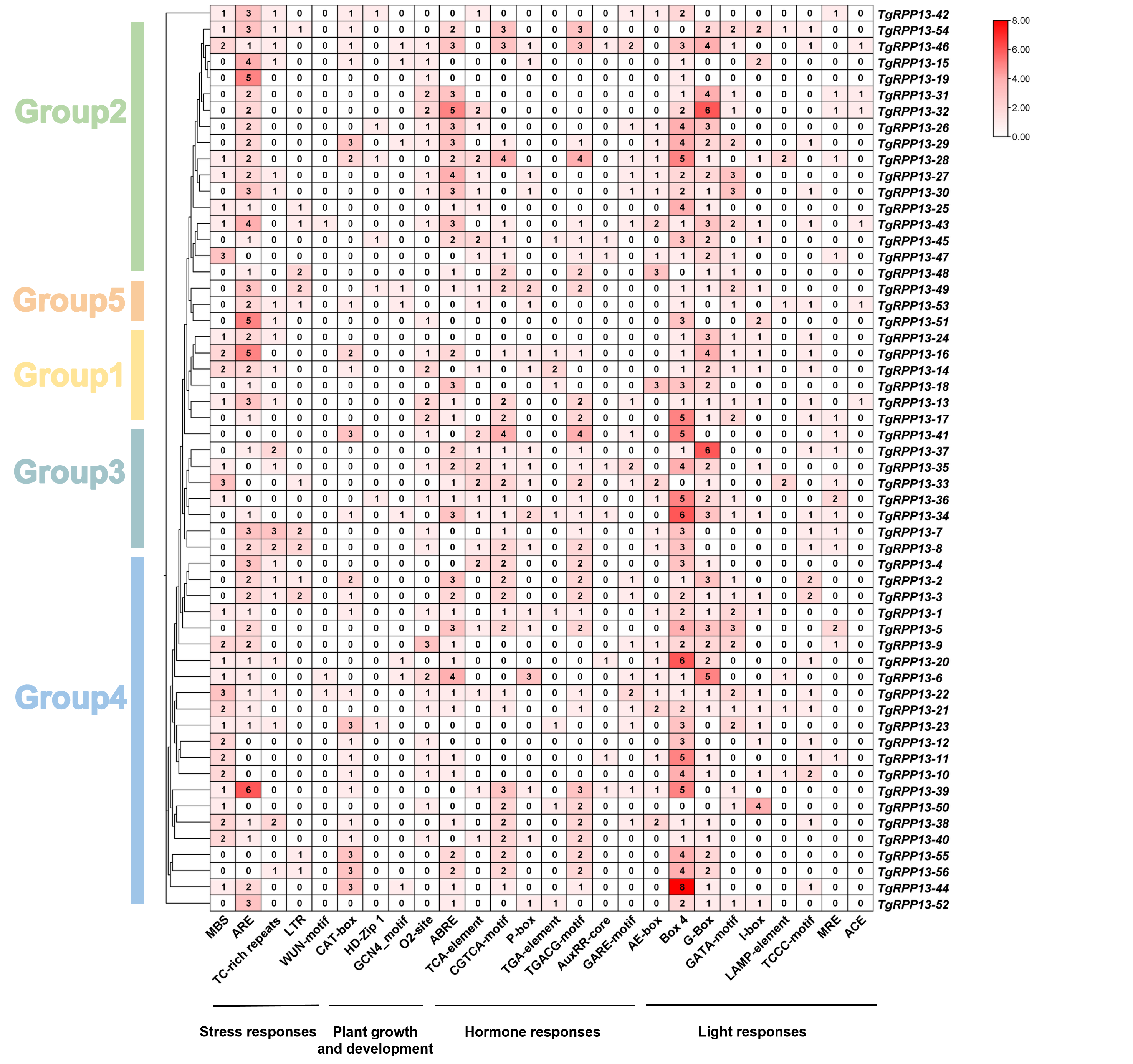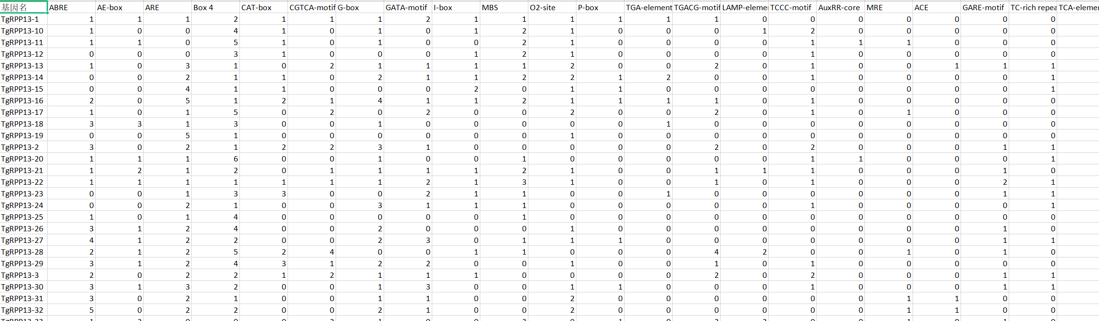 By Tingting, 31 December, 2025 Forums Researches 根据顺式作用元件的文件进行修改。使用R代码,整理出每个元件的数量,生成以下的文件。再根据文献,将元件分为光元件、生长发育相关、激素相关、胁迫相关的。使用TBtools中heatmap这个模块,进行可视化。 Log in or register to post comments