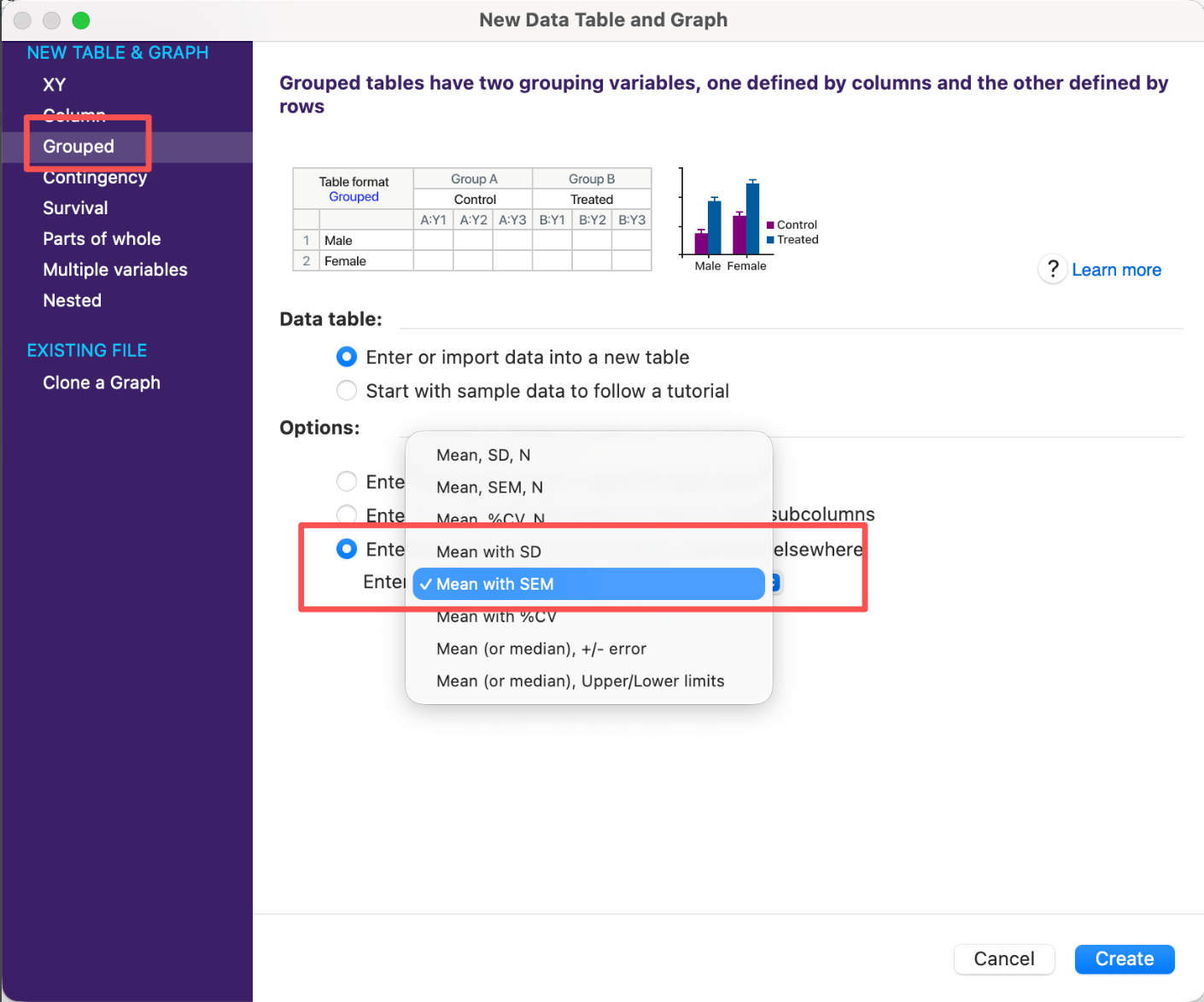 打开Prism软件后,通过双击窗口灰色区域新建工程文件。在弹出的向导页面选择Grouped表格类型,选择Enter/import data into a new table,选择数据类型为已经计算好的均值和标准误,接下来将作图数据复制粘贴到表格中,如下图。
