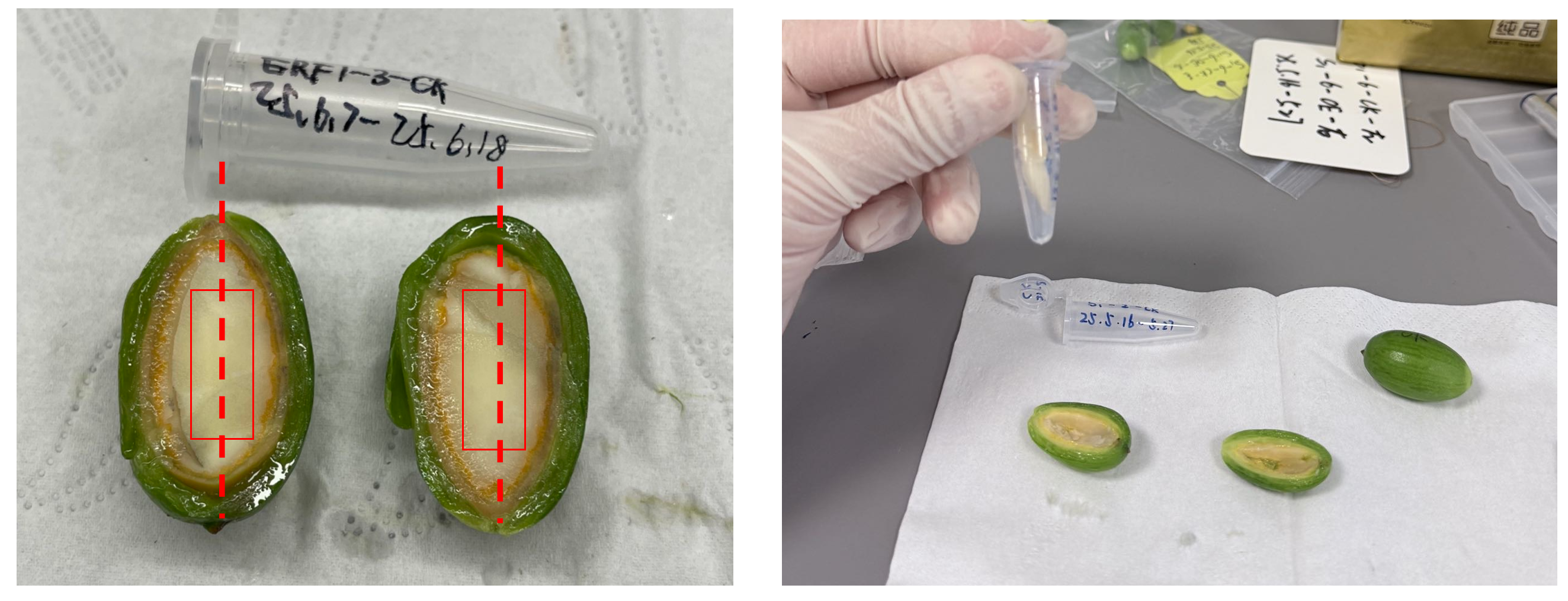 大孢子的种仁取样时是纵向取样的,因此在制作切片时应该将样品朝向一致摆放,沿虚线位置纵切