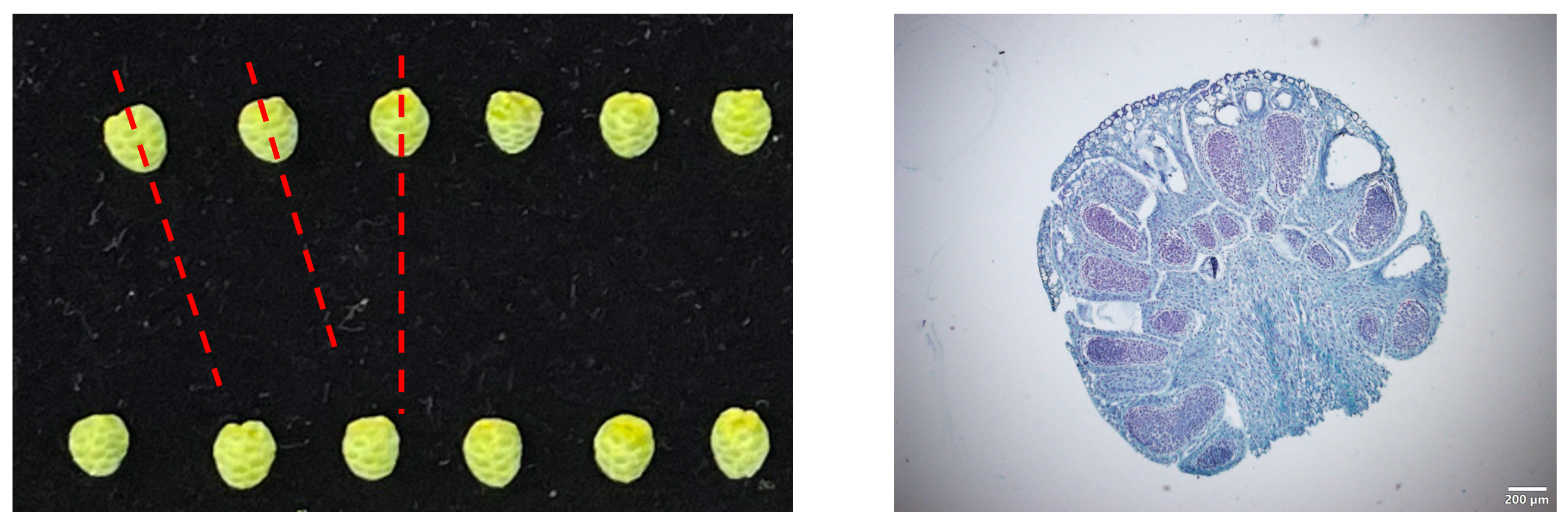 小孢子为图中所示,制作石蜡切片应使得其沿虚线位置纵切,使其在显微镜下呈现右图的效果